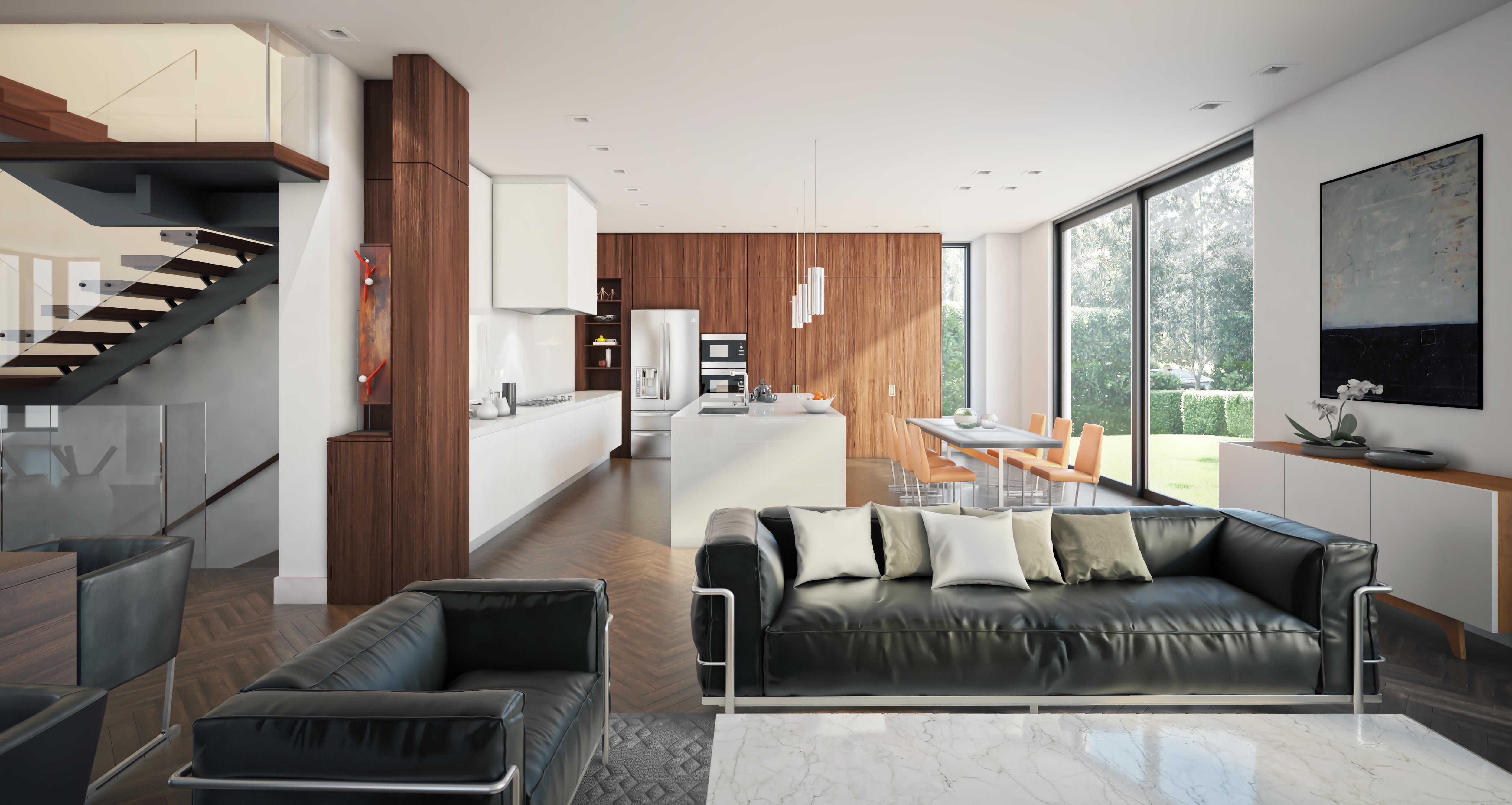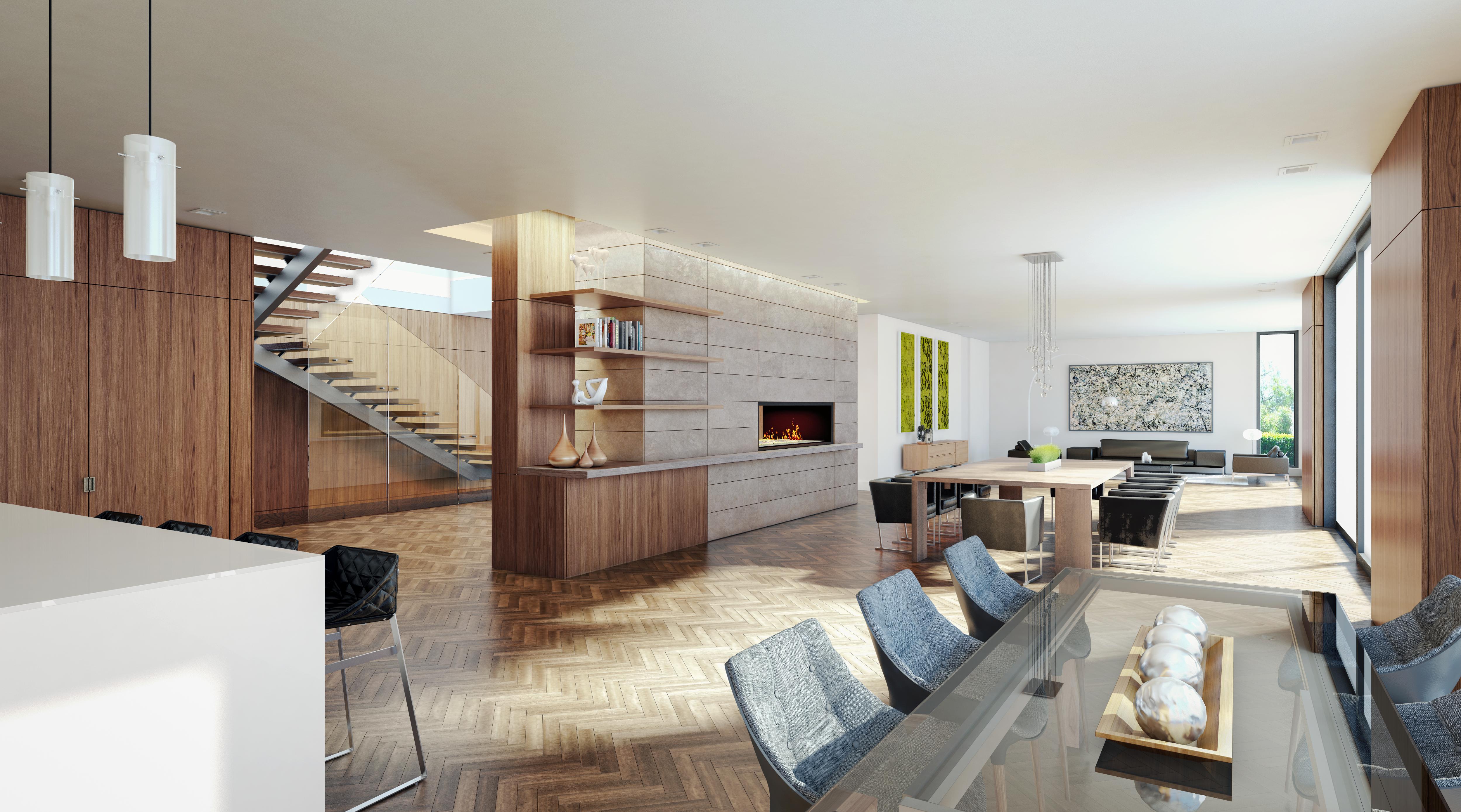 The architectural narrative favors the quality of space over mere square footage. Moving away from the traditional, compartmentalized layouts and heavy ornamentation of nearby Edwardian style homes, we focused on visual transparency and an uncluttered interior vista. The floor plans prioritize the relationship between the kitchen, dining, and family areas, allowing them to flow together as a functional core for the modern family. To facilitate this openness, we integrated features like two-sided fireplaces and over-expressed hallways which define individual rooms without obstructing sightlines. The result is a home that feels interconnected from the front entryway to the rear courtyard, flooded with natural light through expansive glazing and glass railed stair cores.
