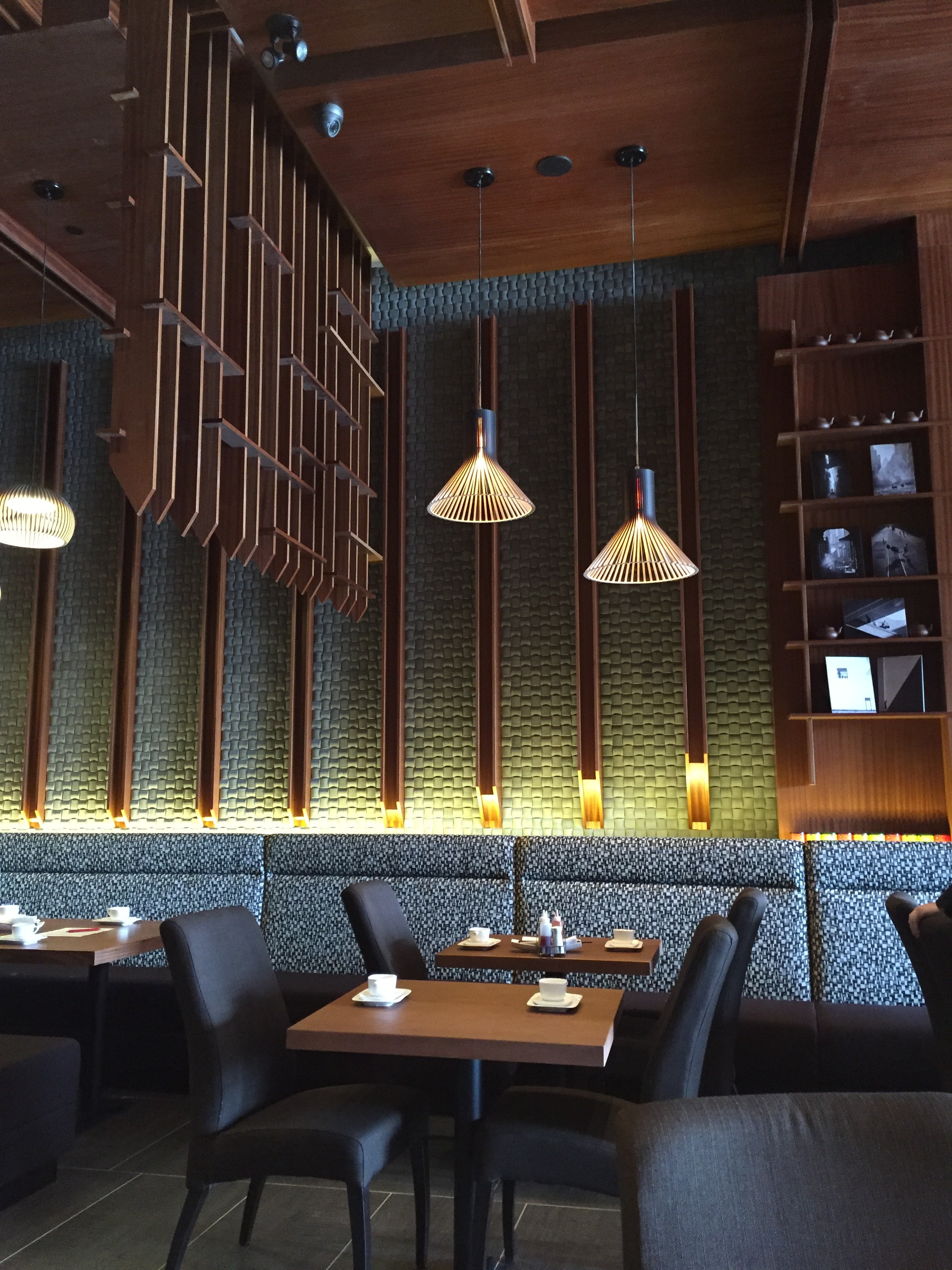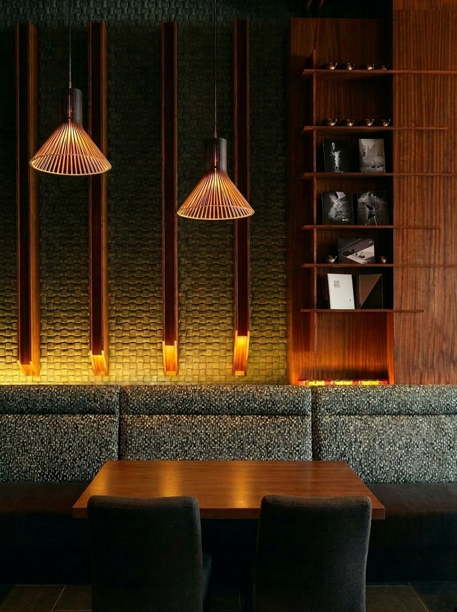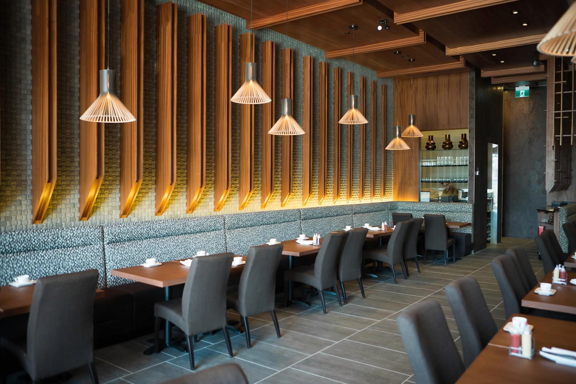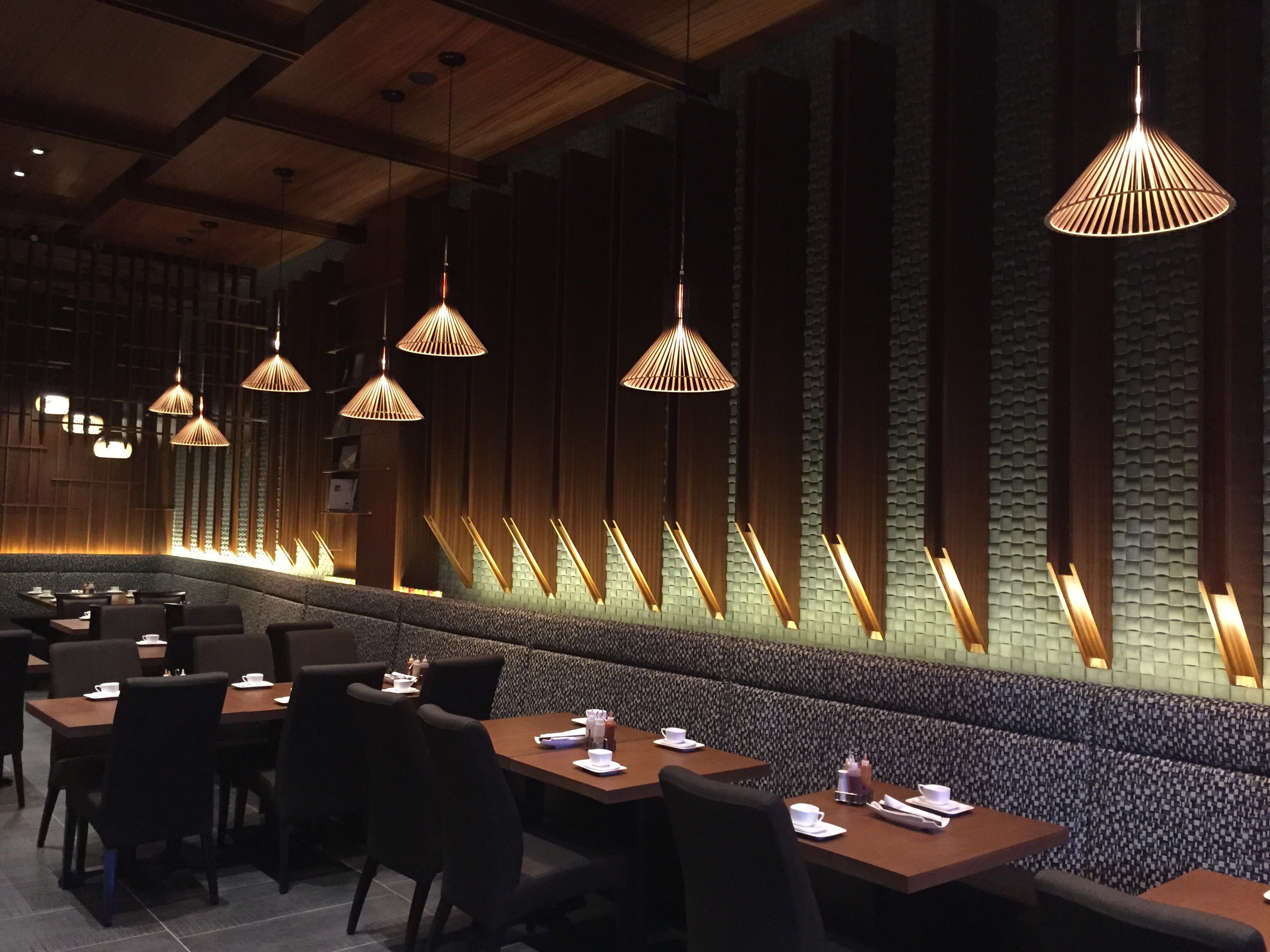 The design concept was inspired by a deconstructed boat hull, featuring intricate wood elements that echo the refinement and delicacy of the restaurant’s dim sum dishes.