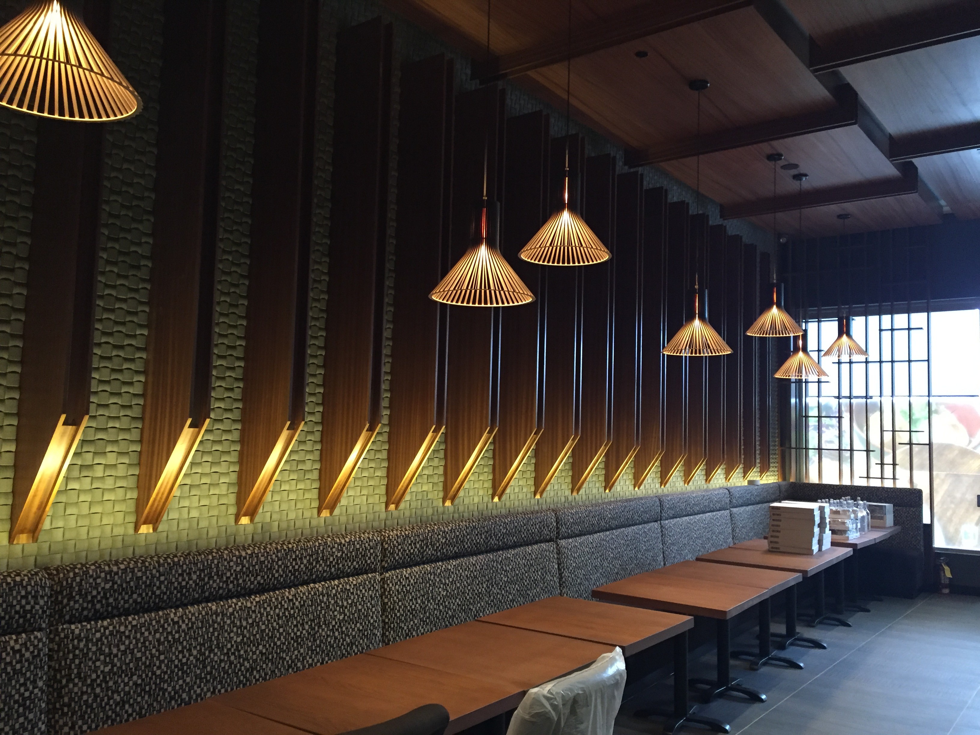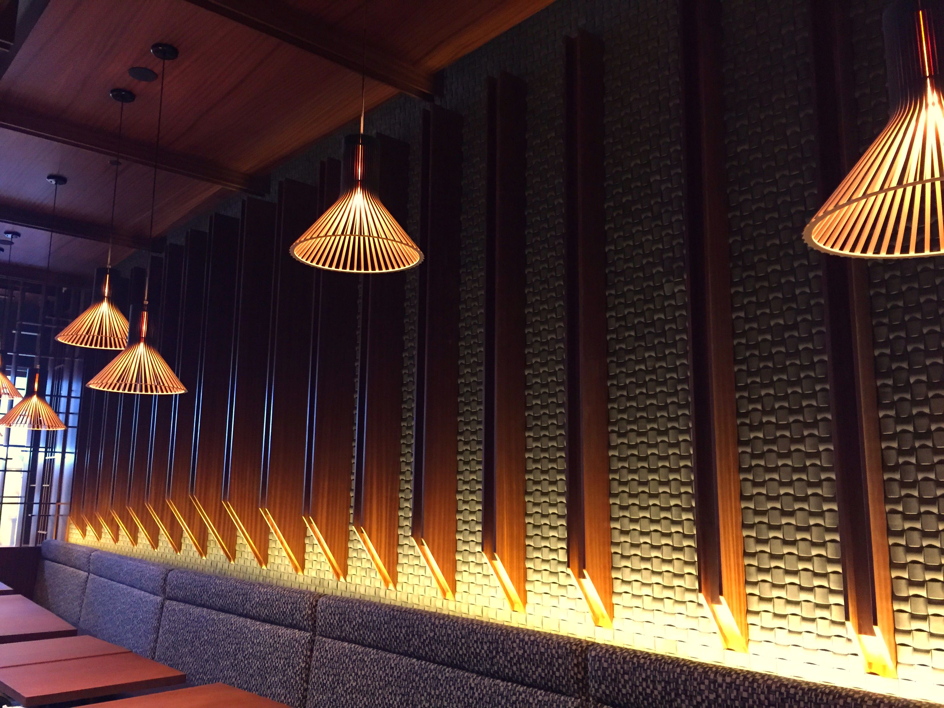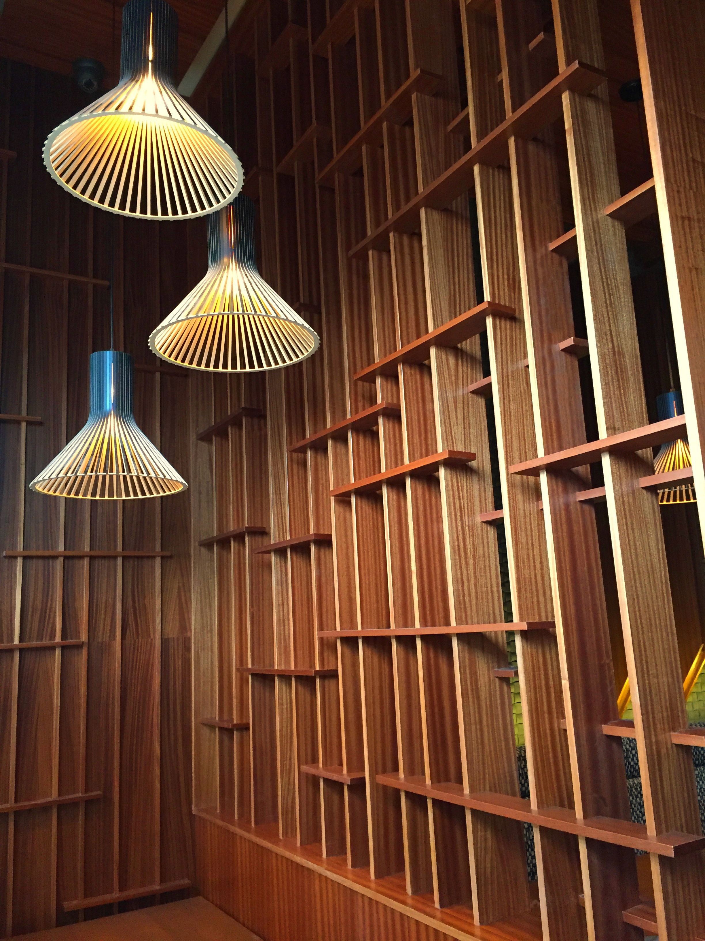 The design concept was inspired by a deconstructed boat hull, featuring intricate wood elements that echo the refinement and delicacy of the restaurant’s dim sum dishes.