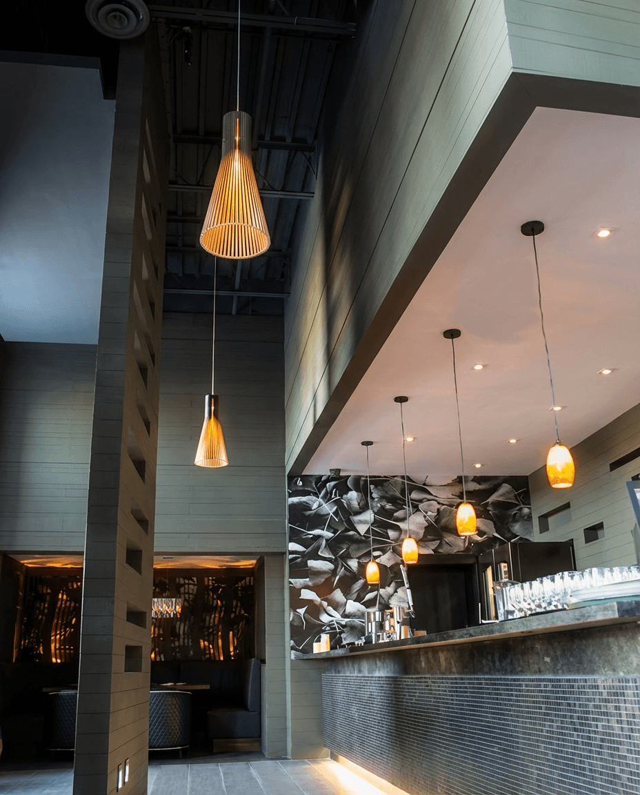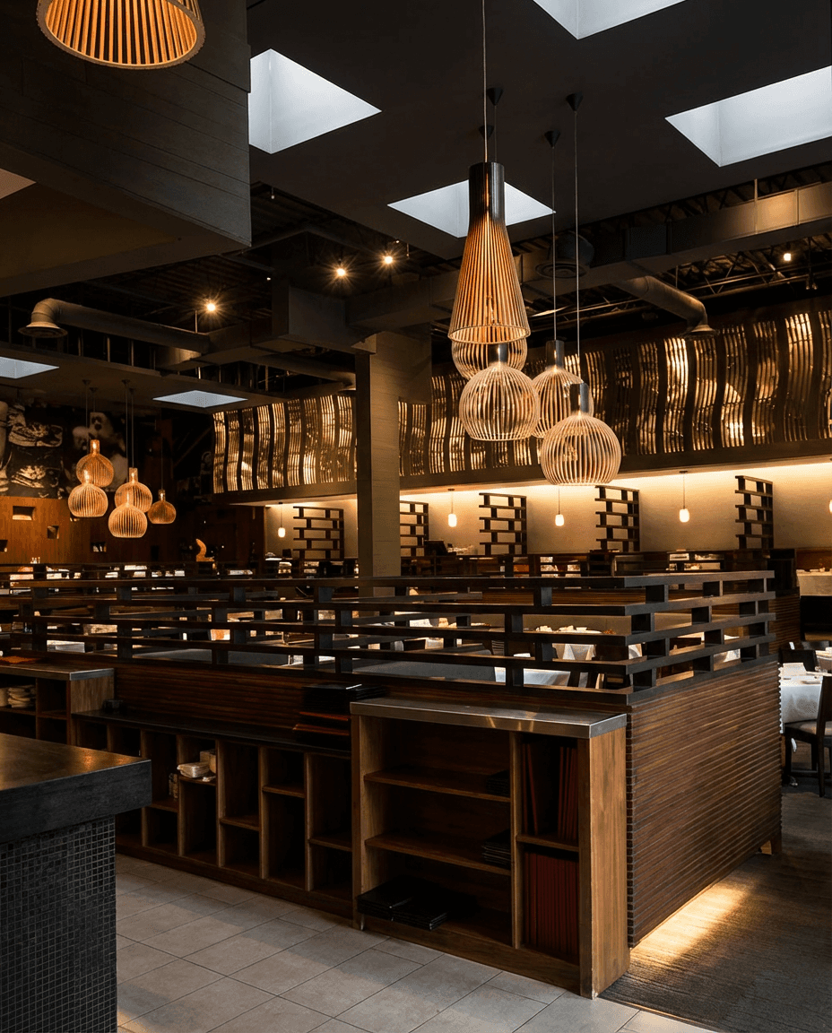 Inside, the design pairs spatial openness with layered detail. Long glass panels, custom hollow wooden light fixtures imported from Italy, and large-format artwork establish depth and atmosphere. A central chandelier composed of spoons, forks, and knives anchors the dining room, reinforcing the restaurant’s identity through material and form.